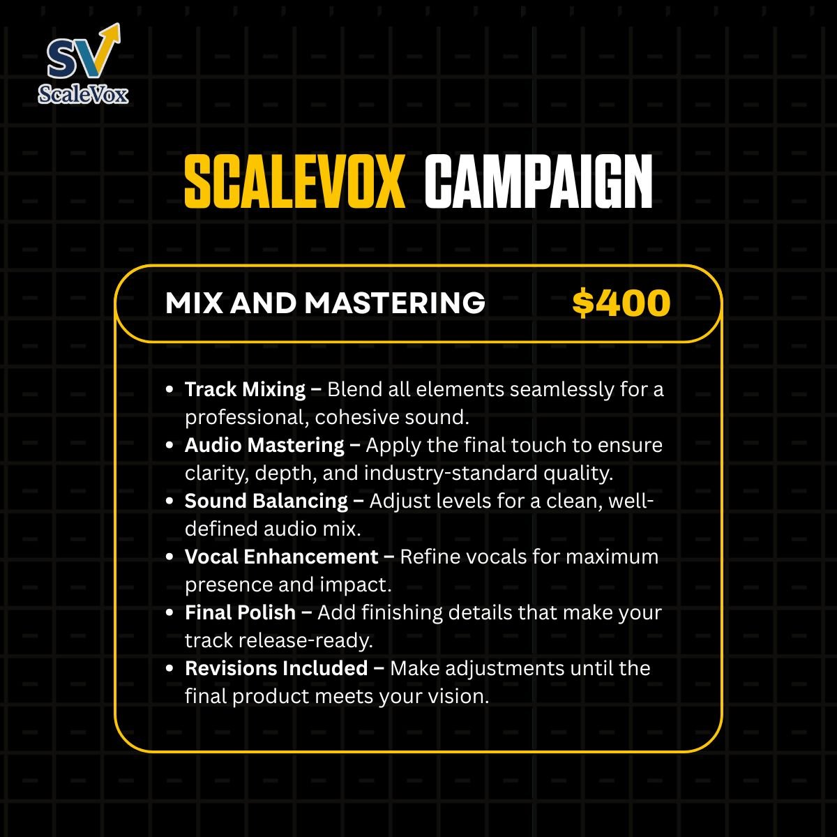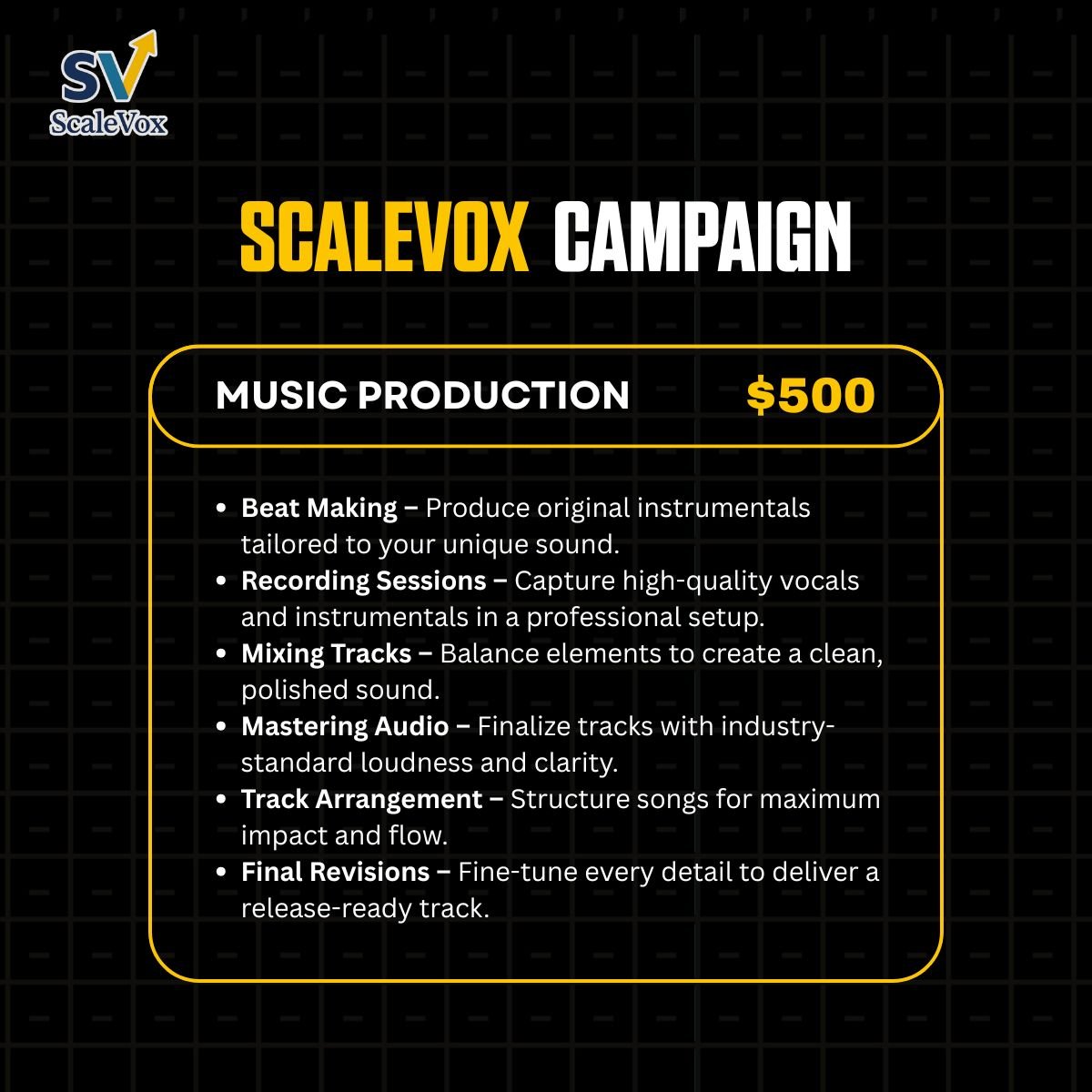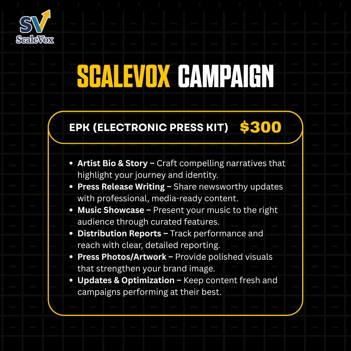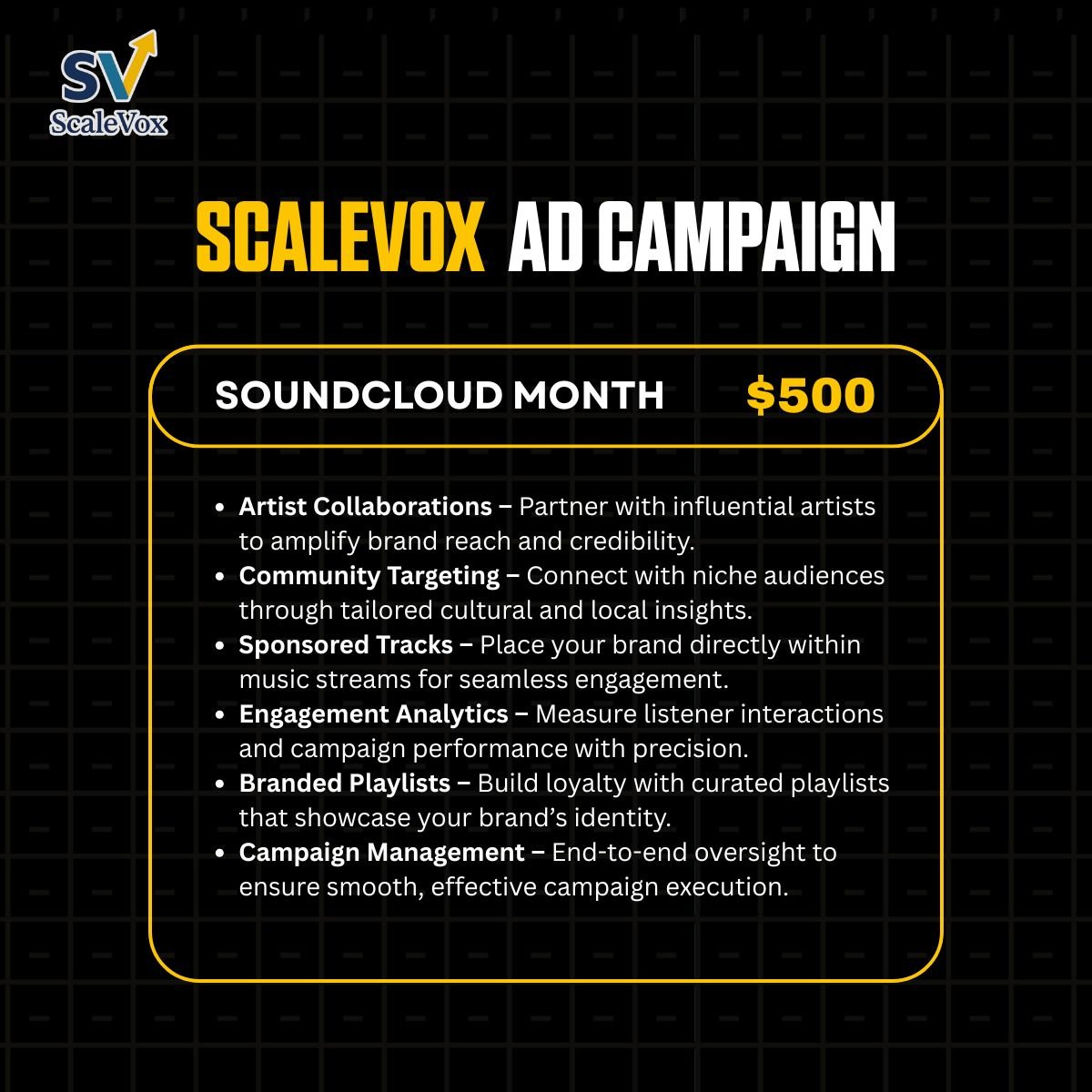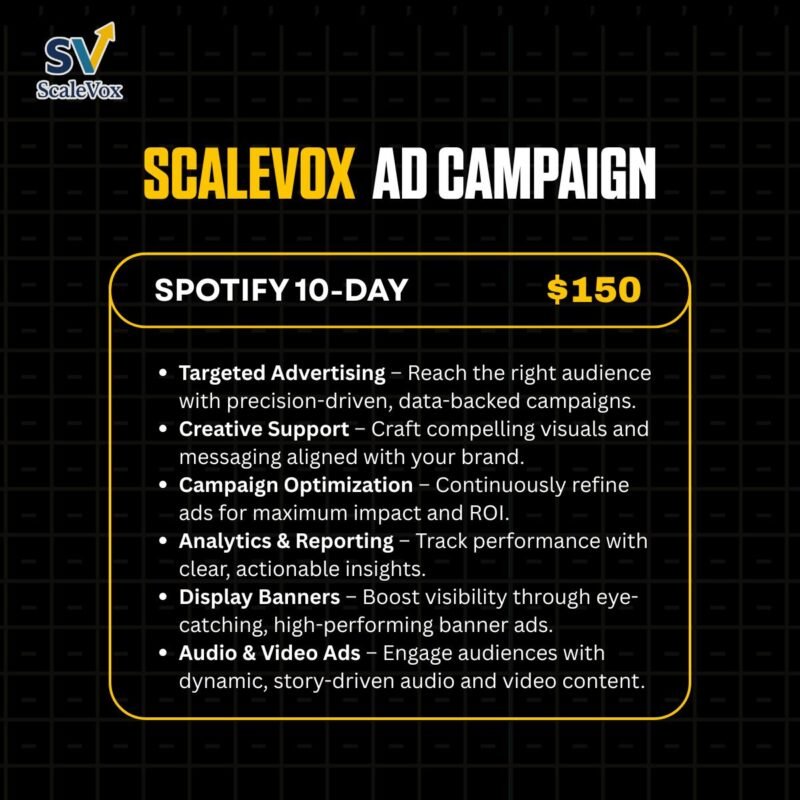 From building my social media presence to getting my song on key playlists, Scalevoxx handled everything with care and precision. I finally feel like I have a real fanbase that connects with my music. Highly recommend for any artist ready to level up.